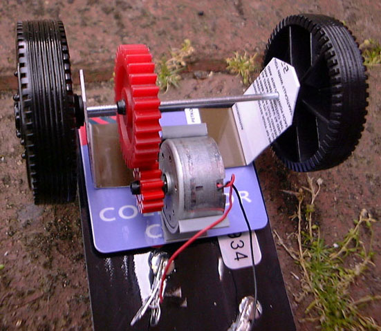 The picture shows a 9 mm diameter pinion gear driving 31 mm diameter axle gear, giving transmission ratio 3.4:1 and ‘O’-ring tyres, outside diameter 40 mm.