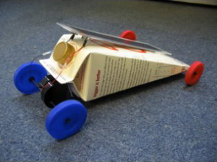 Parts for you to make a solar-powered car. Recycled tetra pack not included.