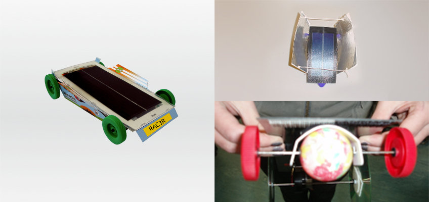 Build single or double cell car, which has four options for front assembly and six options for gear transmission. Use a tetra pack carton for car body shell. Design/build wheels and body shells. Transform car into a gearbox solar boat. Virtual car assembly.